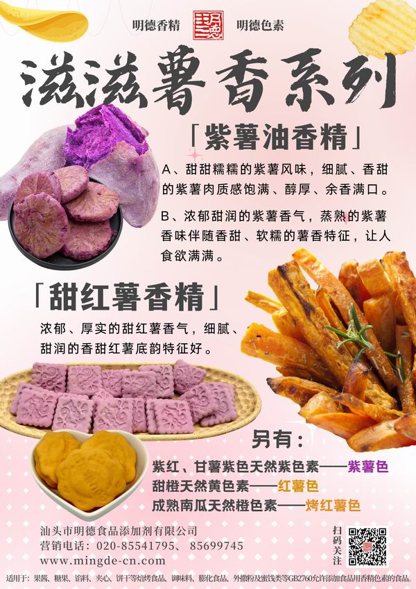 在薯味香精領(lǐng)域我們數(shù)十年潛心專研,迎合市場(chǎng)需求,滿足消費(fèi)者喜好,汕頭市明德食品添加劑有限公司,推出了多種風(fēng)味的番薯風(fēng)味香精,如:紫薯香精、紅薯香精、烤紫薯香精、烤紅薯香精、甜紅薯香精等。